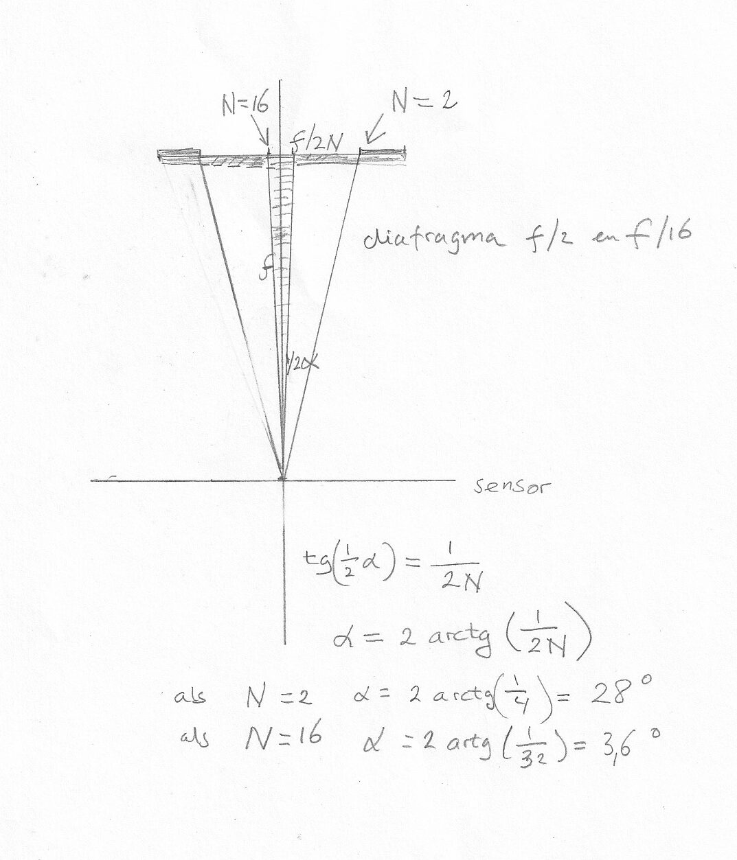 Diafragmawaarde 8, ook geschreven als f/8 betekent dat de diameter van het diafragma 1/8 maal de brandpuntsafstand is. Bij een 50 mm lens staat dan het diafragma iets meer dan 6 mm open. Bij een 600 mm lens wordt dat 75 mm. Op die manier is de diafragmawaarde een van de lens onafhankelijke maat voor de breedte (in graden) van de lichtbundel die vanaf de lens één punt op de film/sensor belicht. Bij een lange telelens moet het diafragma veel wijder openstaan dan bij een korte groothoeklens. Een diafragma f/16 geeft altijd een lichtbundel van ongeveer 4 graden van de lens naar de film/sensor. Bij een diafragma f/2 is dat ongeveer 28 graden. Zie de figuur hieronder.