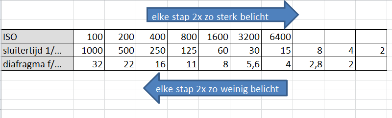 Willen we een foto 2x zo sterk belichten kan dat op drie manieren: de ISO verdubbelen, het diafragmagetal een stop lager te kiezen of de sluitertijd verdubbelen. Willen we een foto 2x zo weinig belichten kan dat door de ISO te halveren, het diafragma een stop hoger te kiezen, of de sluitertijd te halveren. Door een combinatie van deze twee mogelijkheden blijft de belichting gelijk. ISO 250; 1/250;diafragma 8 geeft bijvoorbeeld dezelfde belichting als ISO 500; 1/1000; diafragma 5,6 bijvoorbeeld.