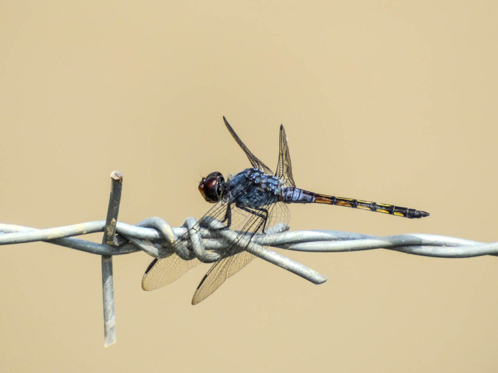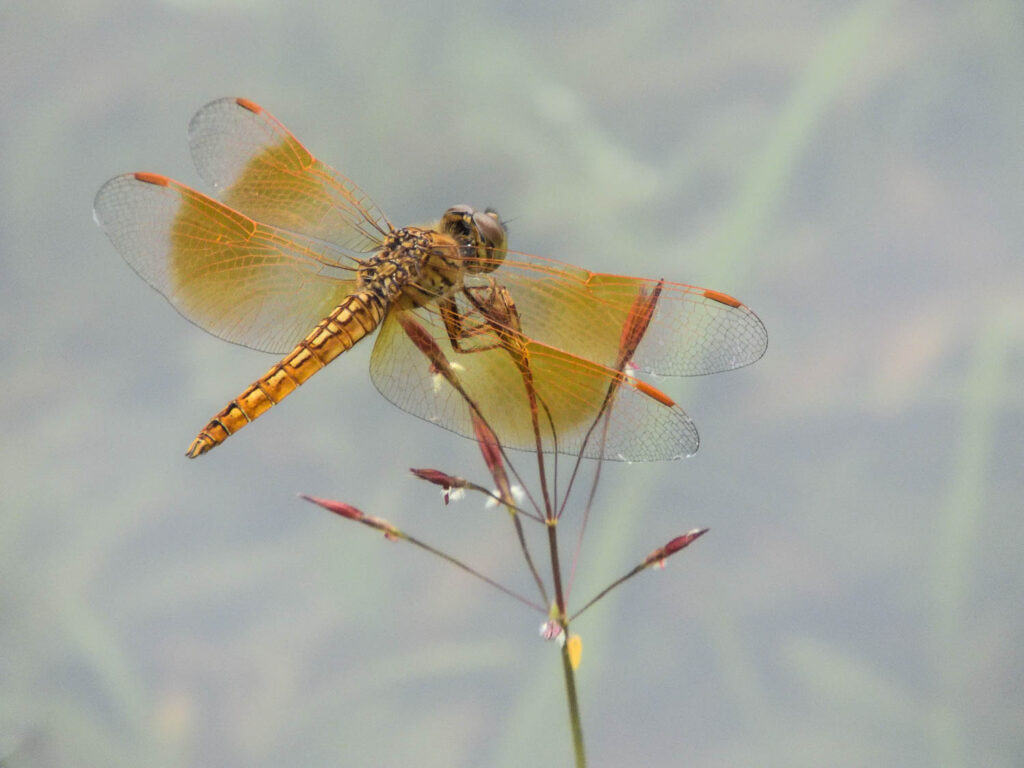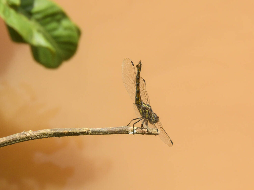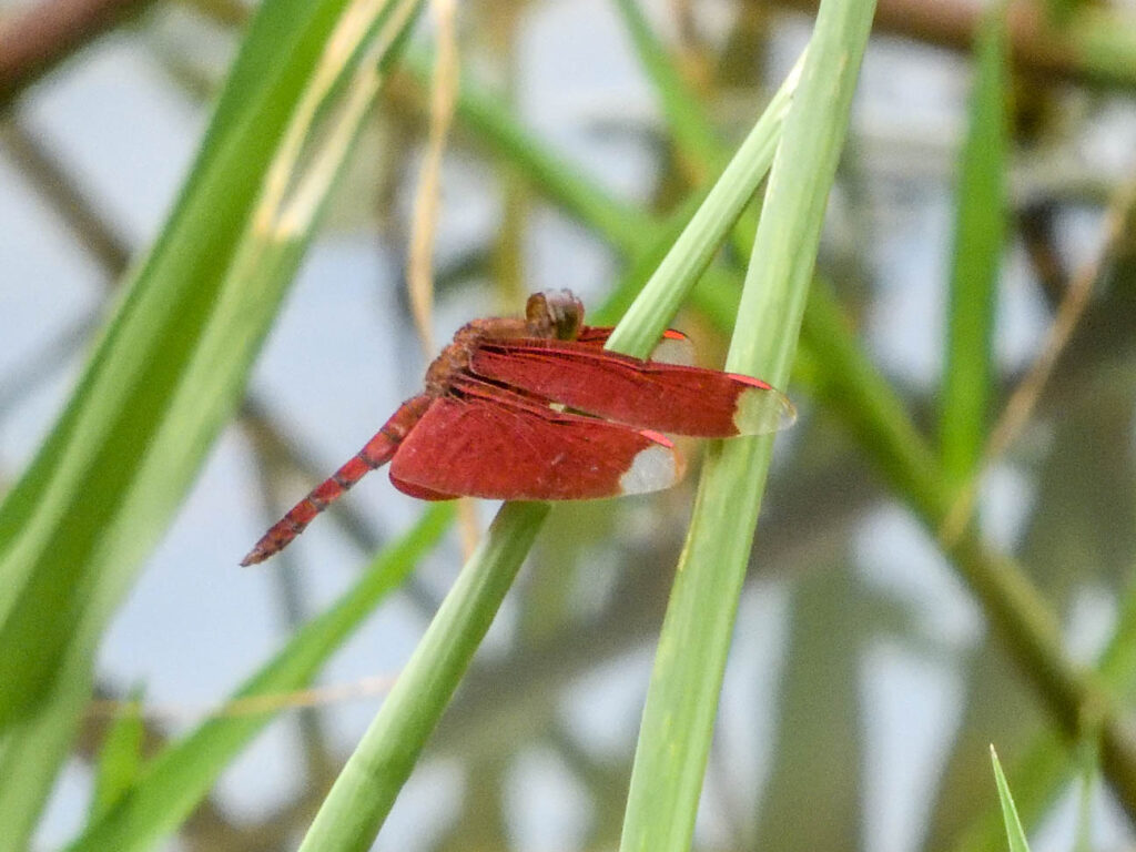 Wel ben ik bij de tempels van Champassak op libellenjacht gegaan. Bij het wetland achter de tempels en de door de hoge waterstand ondergelopen velden zag ik verschillende libellen die wel iets aan onze Nederlandse libellen doen denken, maar toch allemaal anders zijn. Het meest algemeen was daar de slanke oeverlibel (Orthetrum sabina), inderdaad veel slanker dan onze oeverlibel. Een libel die wat aan onze heidelibellen doet denken is swamp watcher (Potamarcha congener). Maar één keer zag ik een libel met prachtig rode vleugels, de Russet percher (neurothemis fulvia). Ik dacht eerst nog dat ik een vlinder had gefotografeerd. Heel mooi waren de vele exemplaren van de Ditch jewel (Brachythemis contaminata), die over het ondergelopen land bij een van de tempels vlogen. Ik zag maar één waterjuffer, die wel iets leek op een kanaaljuffer of een watersnuffel: de Eastern lillysquatter (Paracercion melanotum). En hier eindigde mijn korte kennismaking van de libellen van Zuidoost Azië. Een vervolg zit er niet echt in.
