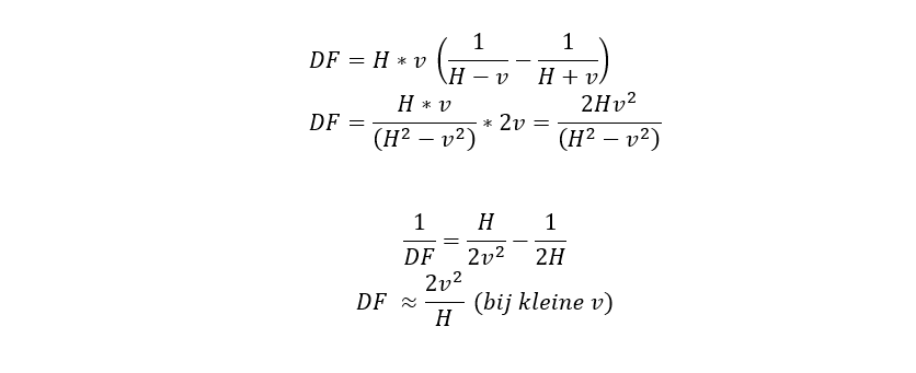 Bij kleine afstanden v is de scherptediepte bijna onafhankelijk van de gekozen brandpuntsafstand. Ik kan dat met de volgende formules eenvoudig laten zien.