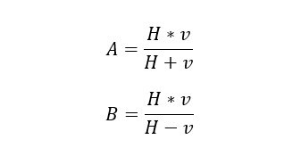 Waarbij v de ingestelde afstand is. Het is duidelijk dat B oneindig wordt bij v = H, de hyperfocale afstand. A wordt dan H/2 zoals je mag verwachten.