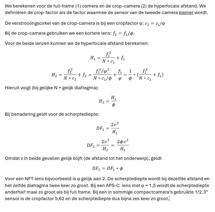 Een crop-camera heeft op dezelfde afstand met een gelijkwaardige lens een grotere scherptediepte dan een full-frame-camera. Dit volgt eenvoudig uit bovenstaande formules. Ik ga in de onderstaande formules ervan uit dat de chip van een crop-camera even veel pixels heeft als een full-frame camera en dat dus de verstrooiingscirkel bij de crop-camera met de cropfactor verkleind wordt.