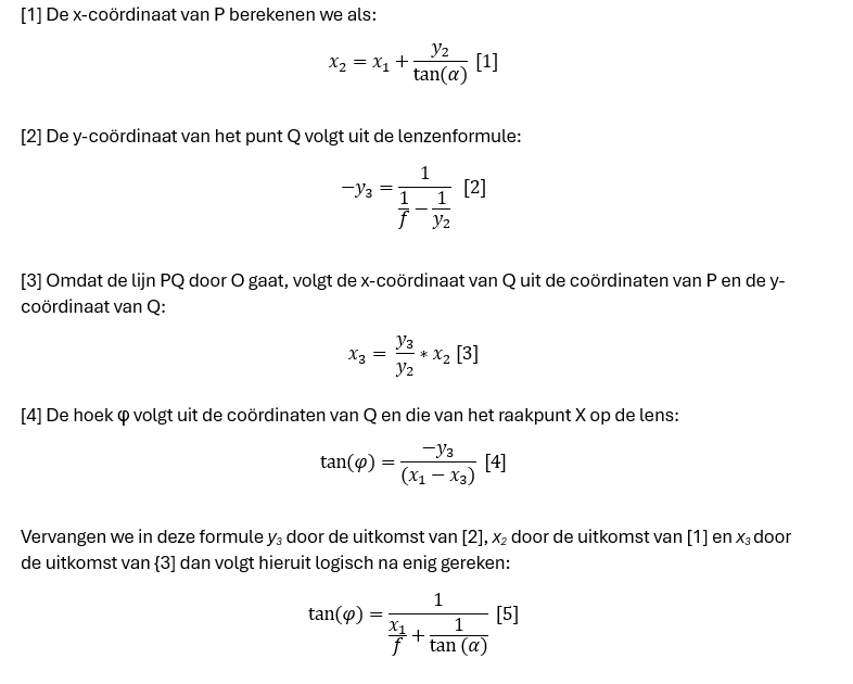 De hoek van de uitgaande straal is een functie van de hoek van de ingaande straal a, het brandpunt f, en het raakpunt op de lens x1 rechts van het centrum van de lens gaat met een hulpvariabele x2, de y-coördinaat van het hulppunt P. De hoek φ is te berekenen door de combinatie van vier vergelijkingen. We rekenen de hoeken vanaf de x-as.
