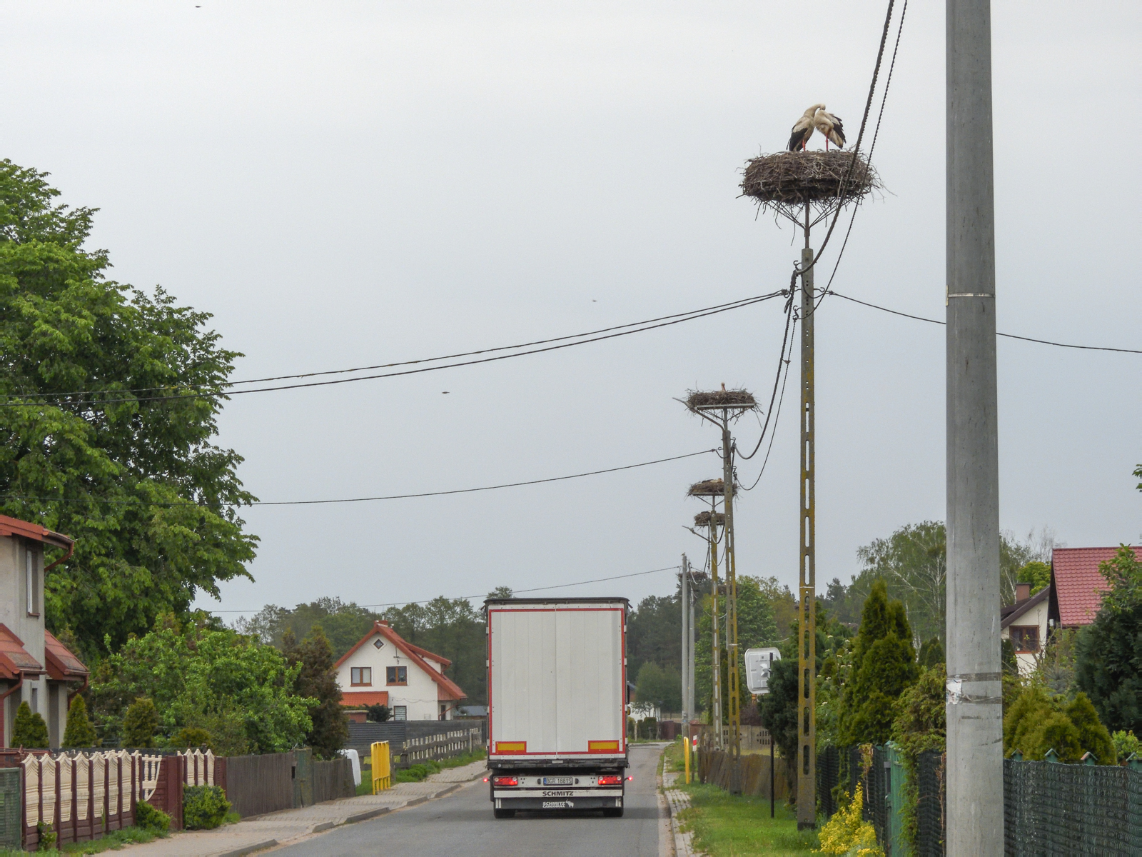 Ik rijd met mijn 20 jaar oude Gazelle op een kleine weg door een Pools dorp. Aan de rechterkant staan betonnen palen voor elektriciteits- of telefoonleidingen. Boven op de meeste palen staat een ooievaarsnest. Ooievaars vliegen heen en weer tussen het boerenland grenzend aan dit dorp en de nesten om hun kroost van voedsel te voorzien.